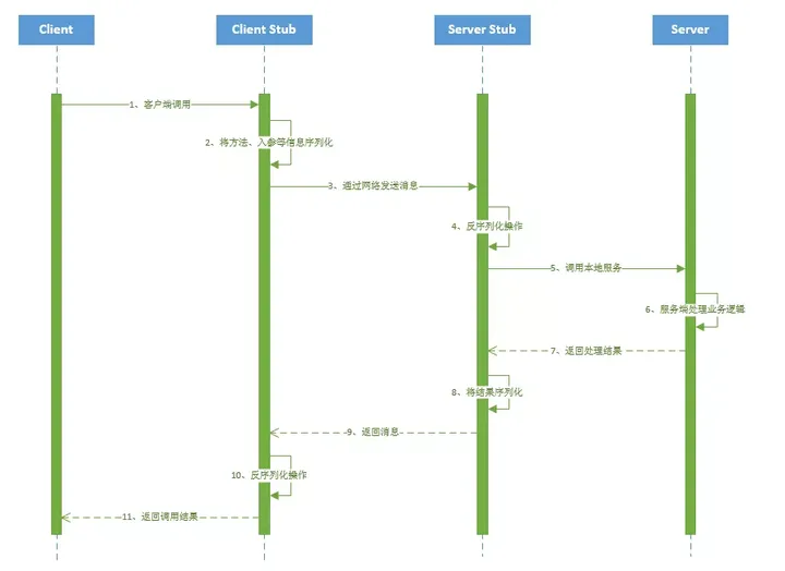 客户端存根(client stub)接收到调用请求后负责将方法、入参等信息序列化(组装)成能够进行网络传输的消息体;