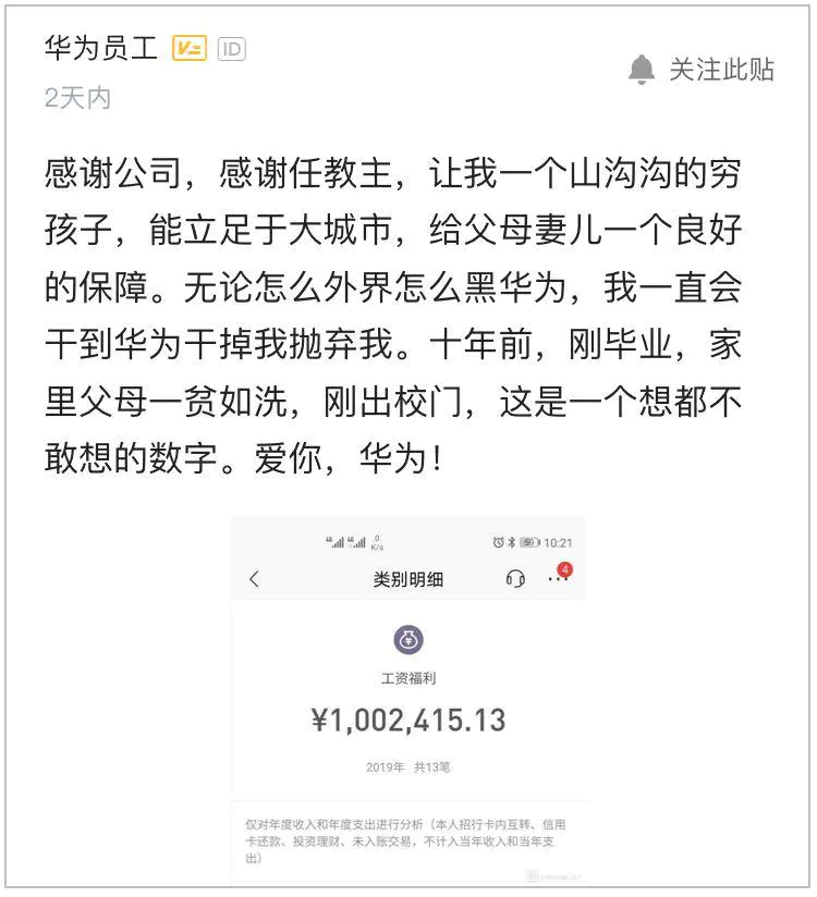 “感谢公司,感谢任教主,让我一个山沟沟的穷孩子,能立足于大城市,给父母妻儿一个良好的保障。无论怎么外界怎么黑华为,我一直会干到华为干掉我抛弃我。十年前,刚毕业,家里父母一贫如洗,刚出校门,这是一个想都不敢想的数字。爱你,华为!”