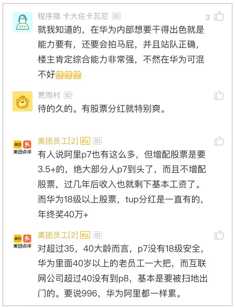 有网友调侃:“你在这里吹牛,就不怕35岁危机吗?”这名华为员工说:“不用担心,首先35岁之前钱已经赚了不少了,而且被开除了也乐意,还可以保留股票,在其他公司没到35就开除了,还没有股票。”