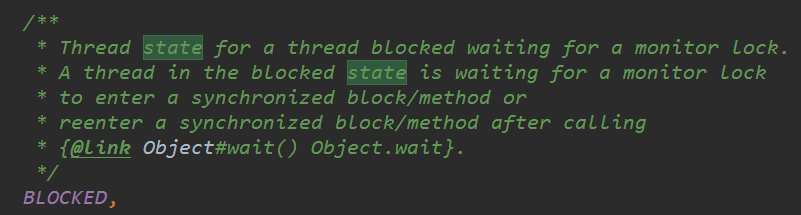 关于BLOCKED状态,注释里只提到一种情况就是进入synchronized声明的临界区时会导致,这个也很好理解,synchronized是JVM自己控制的,所以这个阻塞事件它自己能够知道(对比理解上面的操作系统层面)。