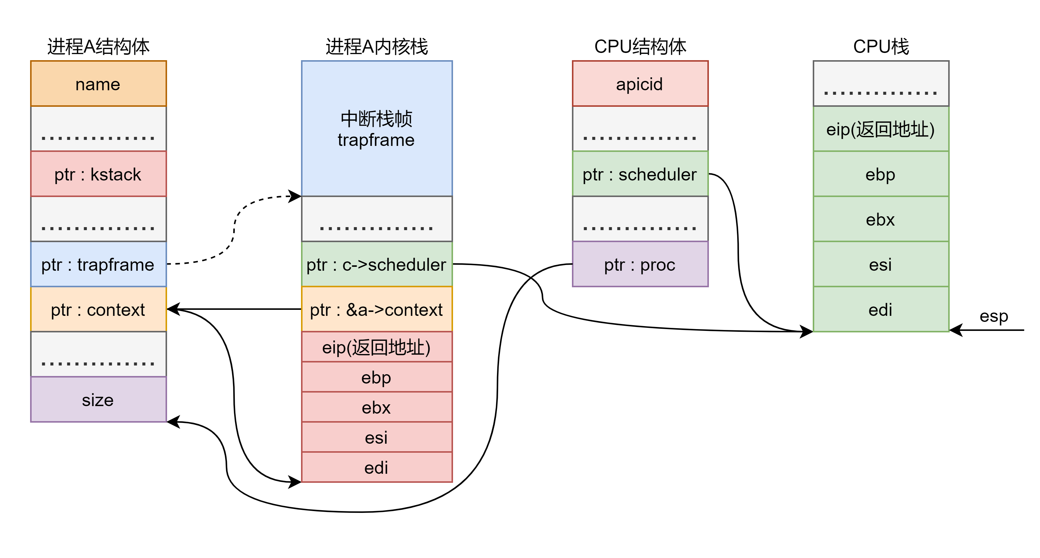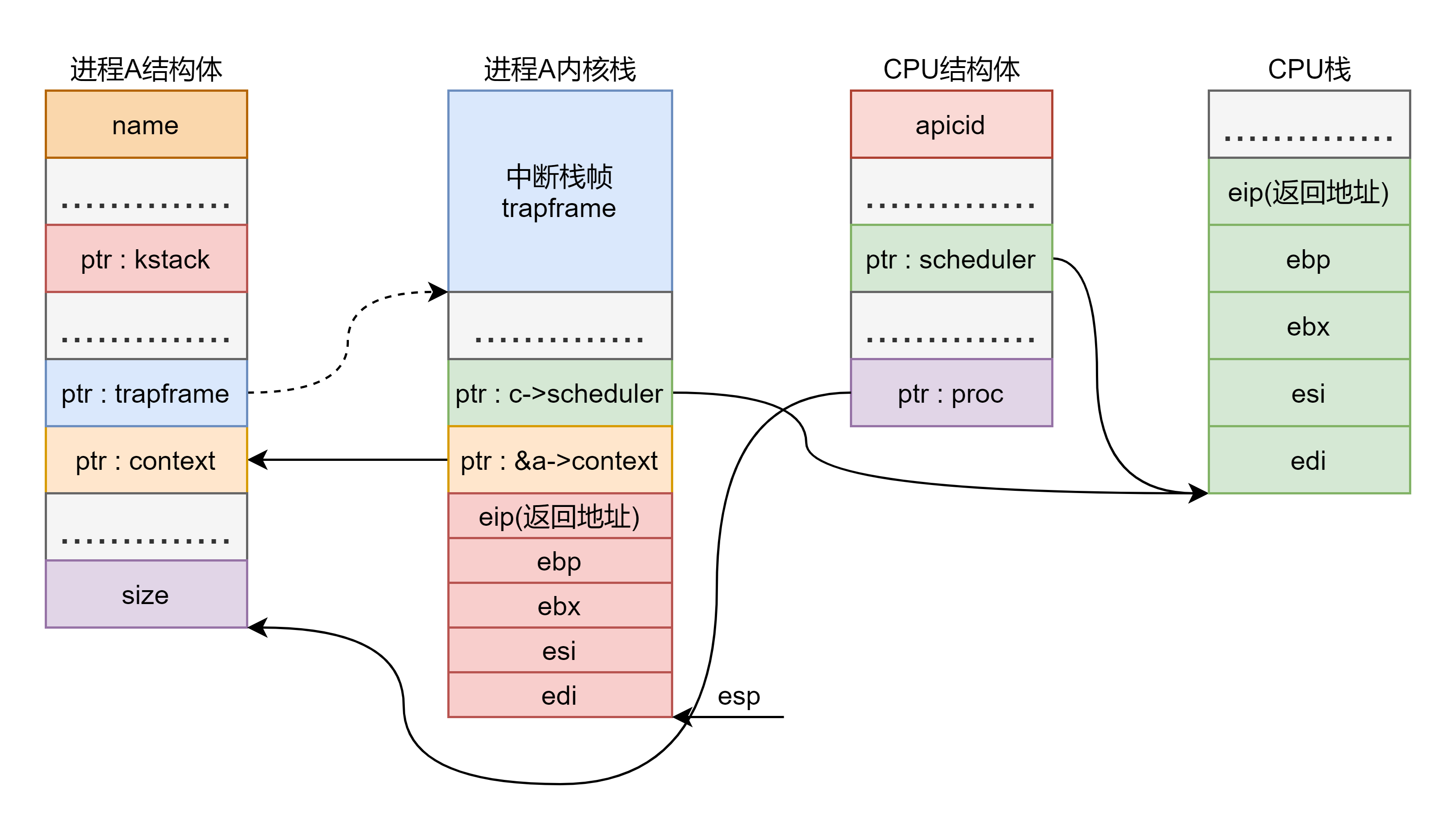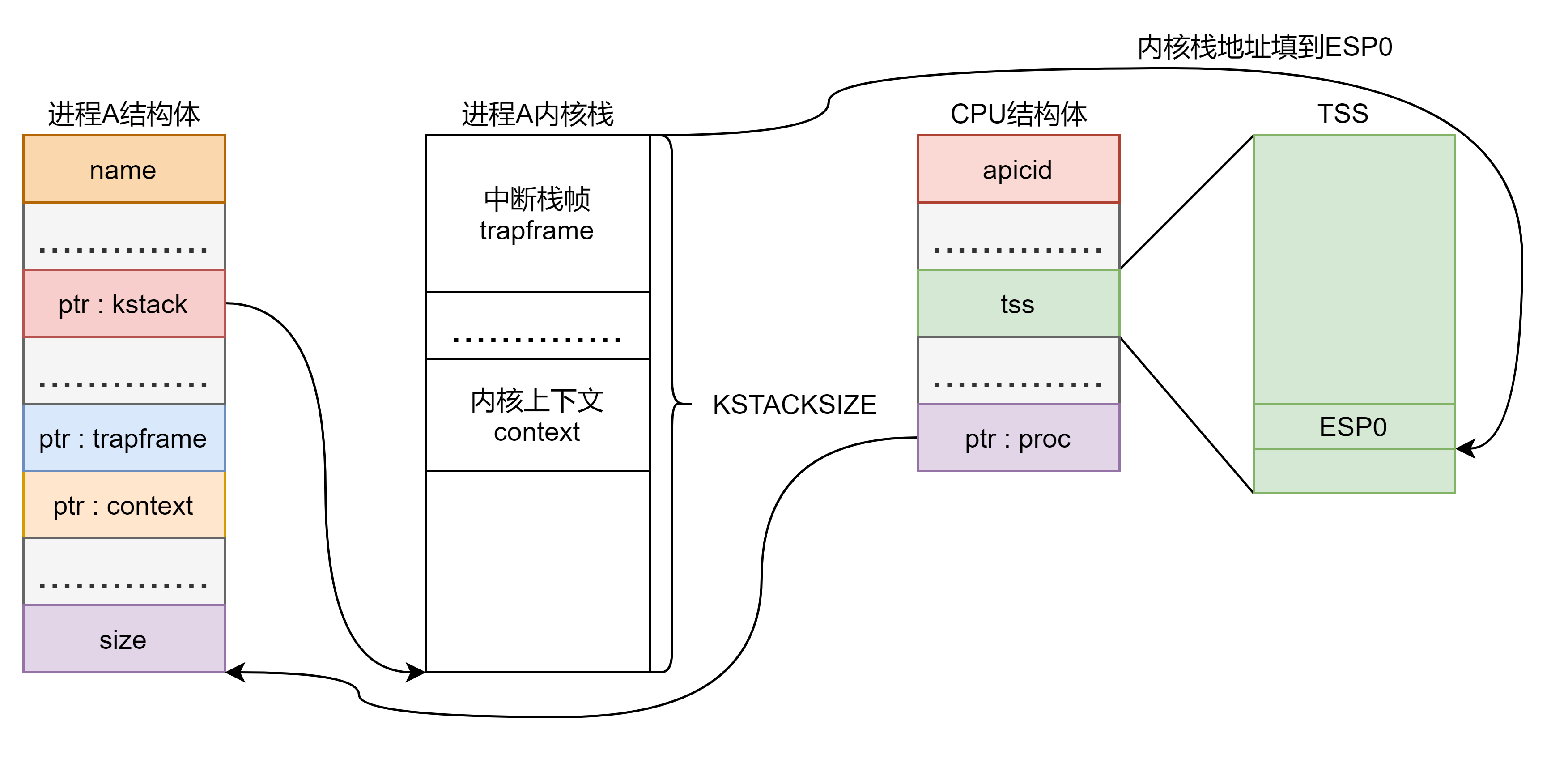 - 进程 A 的栈顶地址保存到了任务结构体的