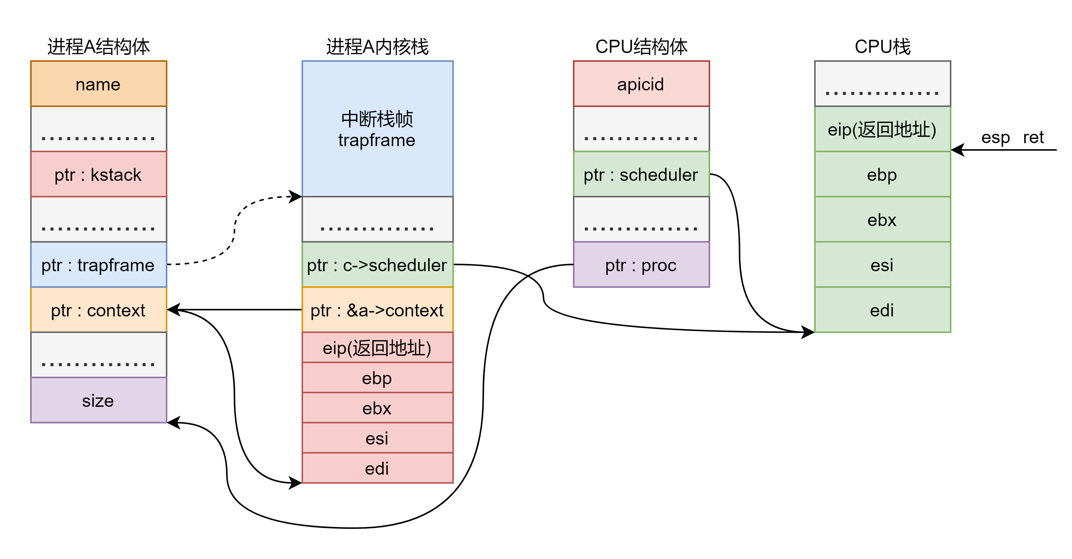 - 将进程 A 的内核栈栈顶保存到任务结构体的 context 字段